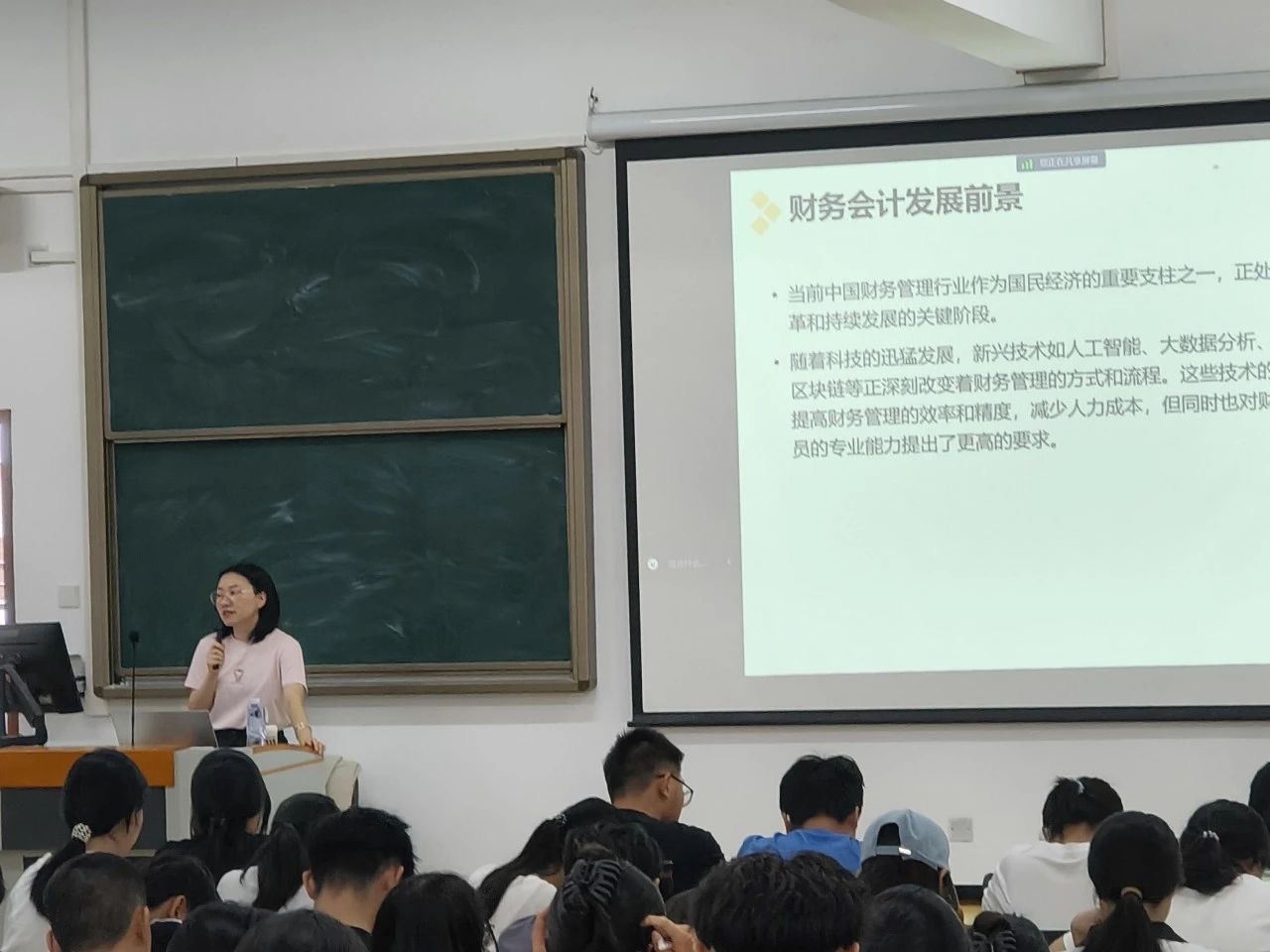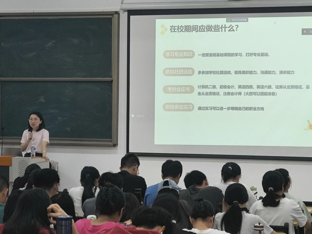 首先,注册会计师卢凤琼为同学们介绍了财务会计的就业方向,接着概括了当前中国随着科技发展财务管理行业的发展就业前景。卢老师还为同学们介绍了科技发展带来的财务工作变化,并为同学们讲解了传统的企业管理和在科技发展浪潮下新型财务组织下管理的不同。最后卢老师指出,在如今的行业前景下,同学们在校期间应积极参加各类实践活动,如财务案例分析、模拟企业运营、财务管理软件应用等,以提升自己的专业技能和综合素质。