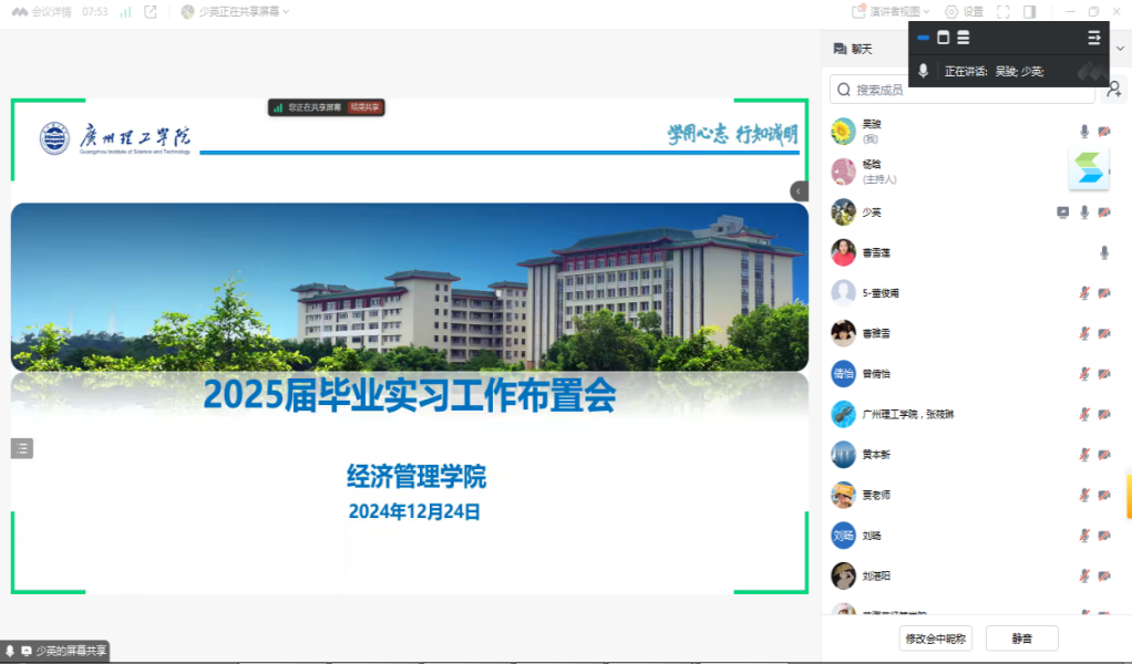 为进一步加强学生实习管理,安全规范有效地开展2025届毕业生实习指导工作,William威廉官网于12月24日召开2025届毕业实习工作布置会,学院副院长陈少英主持会议,全体毕业实习指导老师和辅导员参加会议。