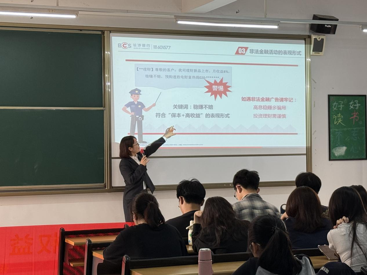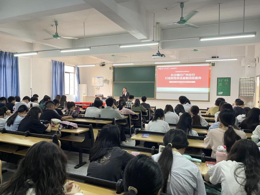 在思政教育成功激发同学们的精神力量后,讲座自然过渡到金融知识板块。长沙银行广州分行高级讲师罗文利聚焦非法金融活动这一关键主题,凭借丰富的专业经验和深入的行业洞察,对“保本+高收益”“内部渠道”等常见金融骗术进行抽丝剥茧式的剖析,还特别指出代理维权、代理征信修复等新兴非法金融活动套路,让同学们对潜藏在生活中的金融陷阱有了更为清晰的认知。为帮助同学们有效防范金融风险,罗讲师还分享了“谨慎核实信息”“切勿盲目投资”等一系列实用防范措施,并以“三个一律,三个切莫”提醒同学们在面对各类金融诱惑时保持高度警惕。