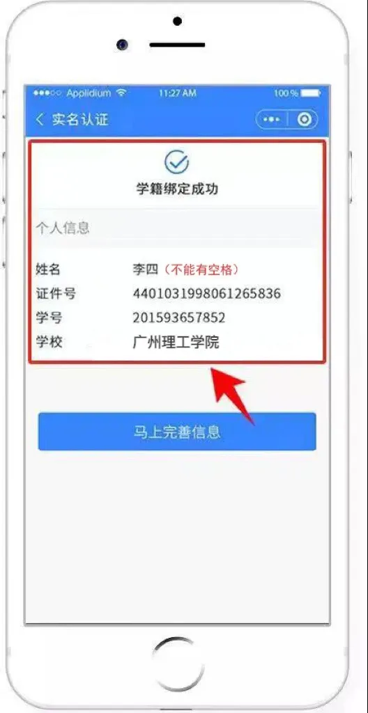(3)“刷脸”成功后,即可进行“学籍绑定”,点击“马上完善信息”可进入“个人信息”的操作。