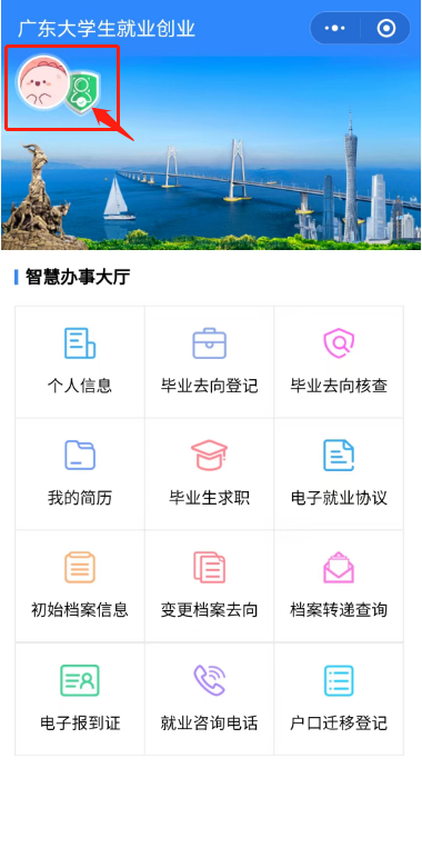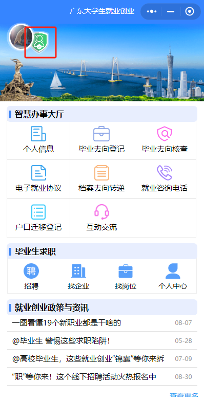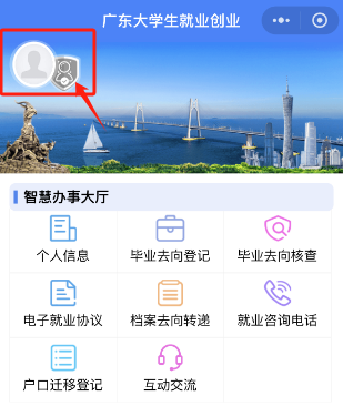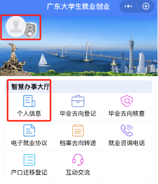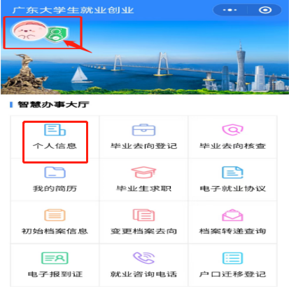 1、登录“广东大学生就业创业”小程序后,可选择从首页进入“个人信息”窗口。
