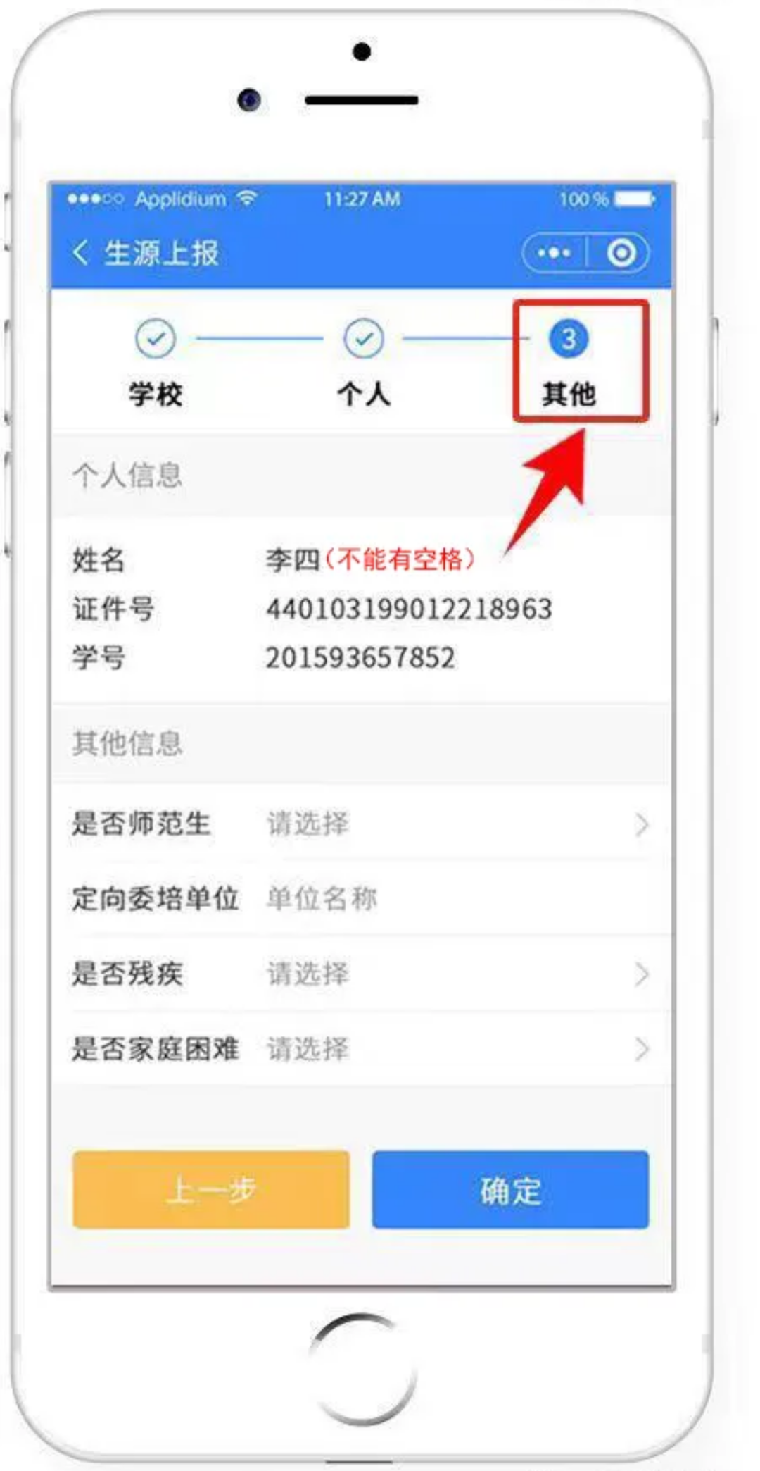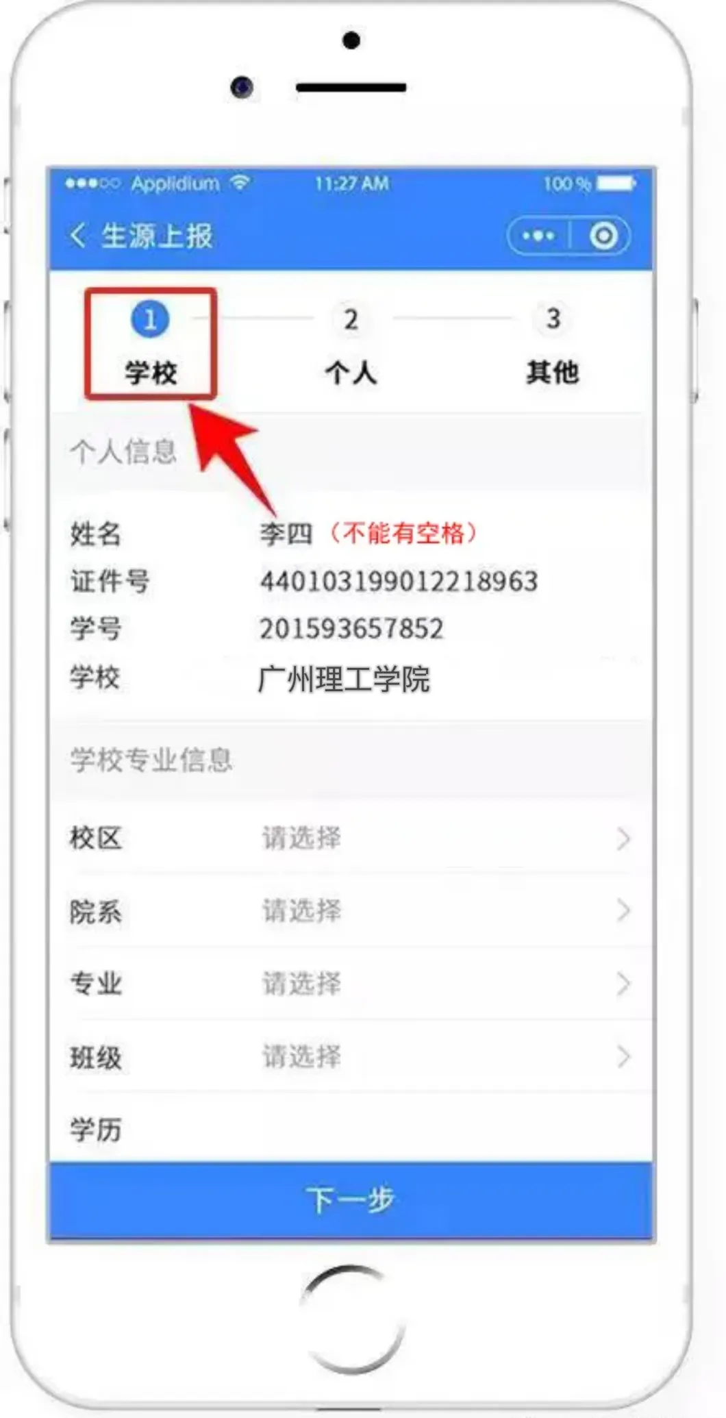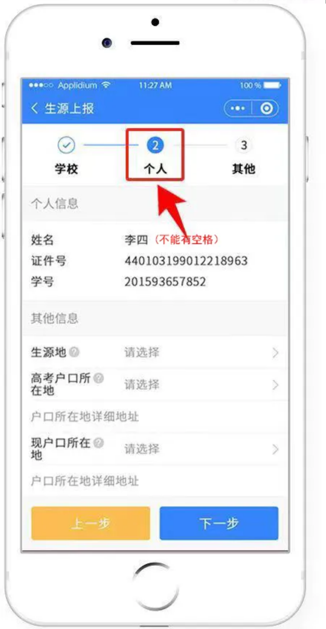 2、依次填写“学校”“个人”“其他”三部分信息。 注意:(1)带*项为必填项; (2)港澳台学生不显示“现户口所在地”的选项。 “生源地” 重点名词解释: 生源地区:是指毕业生当前户口所在地区(如果已迁入学校集体户则以父母户口所在地为准,学校集体户口不能作为生源地)。主要有三种类型: ①未迁入学校集体户的毕业生选择“当前户口所在地区”; ②已迁入学校集体户,毕业后可回原籍复户的选择“原户籍所在地区”; ③已迁入学校集体户,毕业后不可回原籍复户的选择“父母户口所在地区”。 (特别提醒:生源地区关系到毕业时户口、档案等转移,请慎重核实!) 除了东莞、中山暂时不要求到区或县,其他必须是到入读大学前户口所在地的区/县。如汕头市,广东省汕头市金平区;