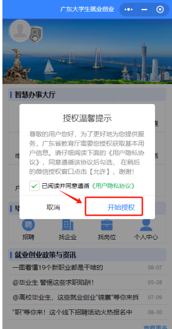 1.进入小程序首页自动显示授权温馨提示,点击“开始授权”弹出小程序授权窗口。