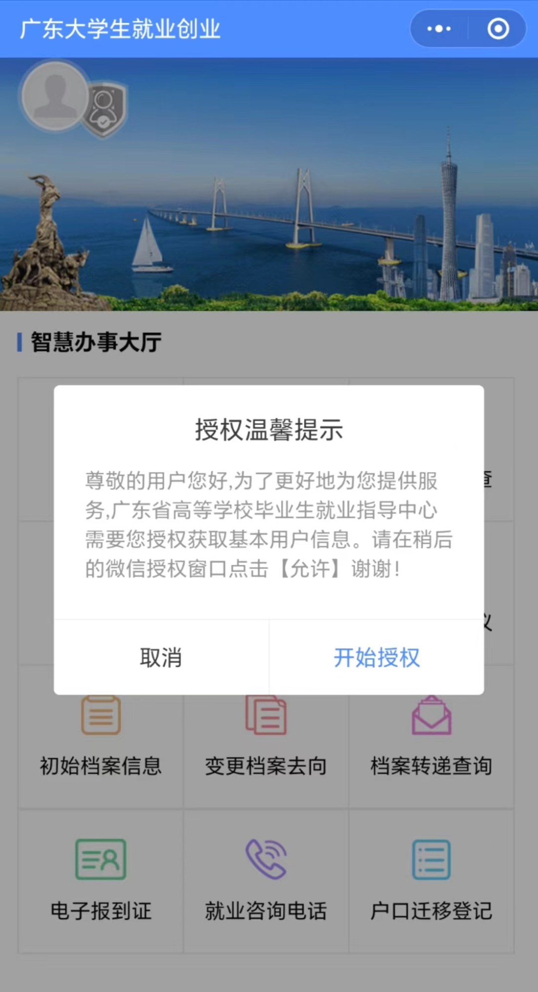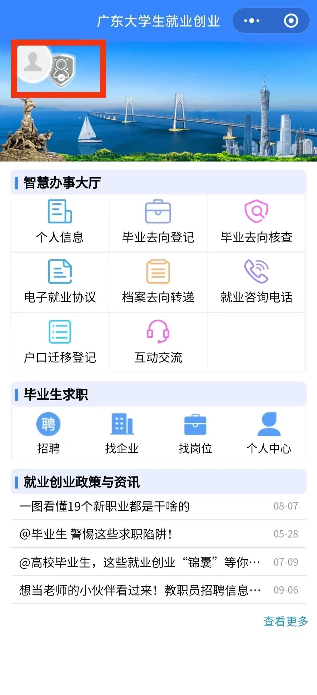 01.搜索“广东教育”微信公众号,关注公众号并点击菜单栏“微政务”--“大学生就业创业”,进入“智慧办事大厅”。