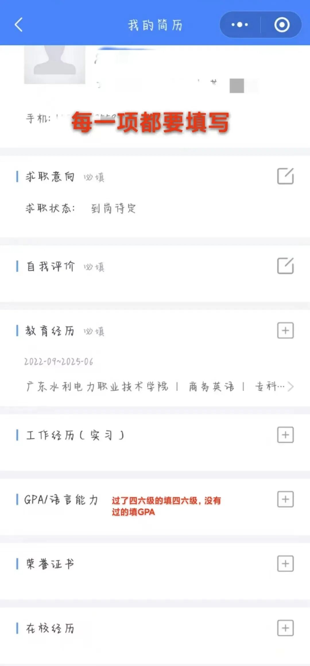 04.创建职业简历”,只有把必填项填写完毕的同学才可以对岗位进行投递哦(完善度需≥60%)。