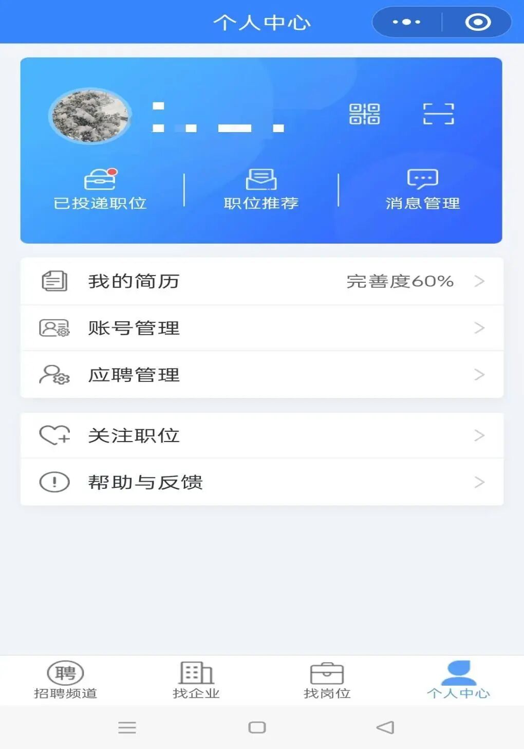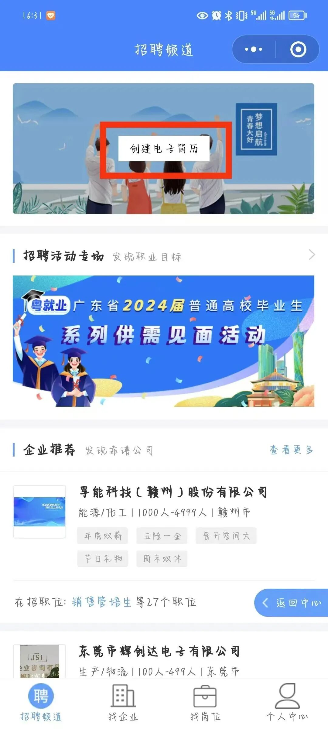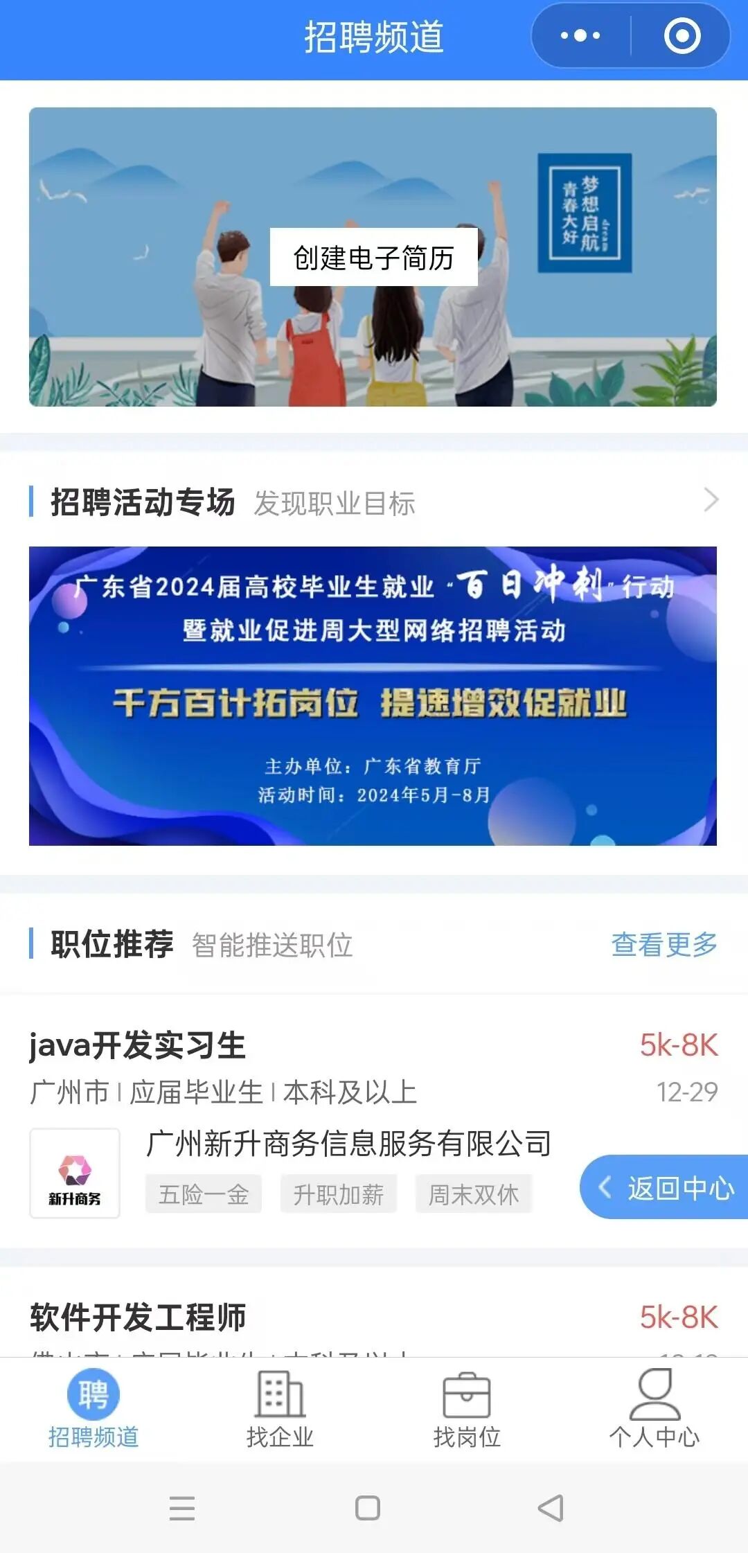 02.来到“广东大学生就业创业”小程序,点击“毕业生求职”“个人中心”,已经绑定过学籍的同学即可完善简历并投递。