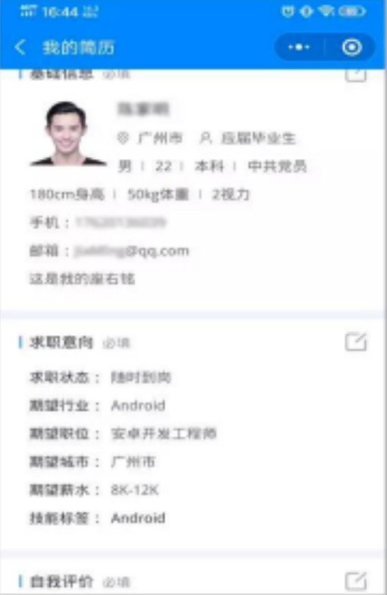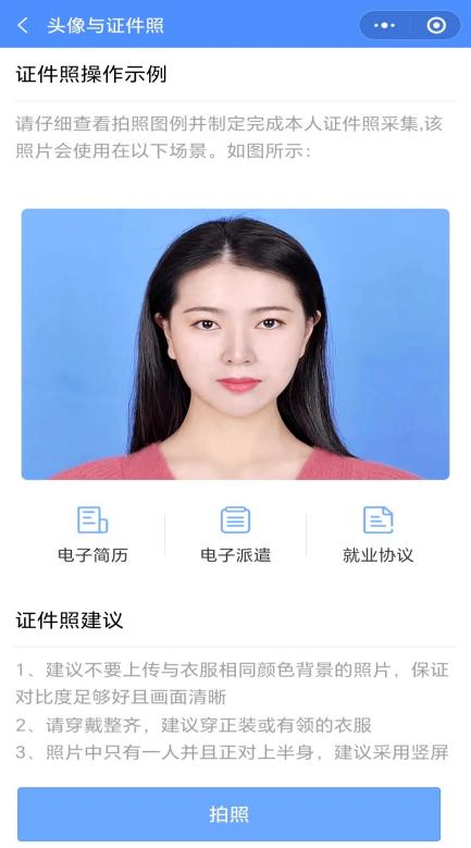 05.点击简历中的头像,手机竖屏拍照上传上半身照片,系统即可快速为您自动生成蓝色背景的证件照片。 生成后的证件照可适用于简历、生源上报(个人信息)、三方协议等系统中的多个服务场景。