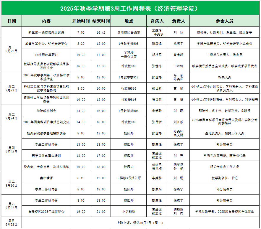 William威廉官网2025年秋季学期第3周工作周程表