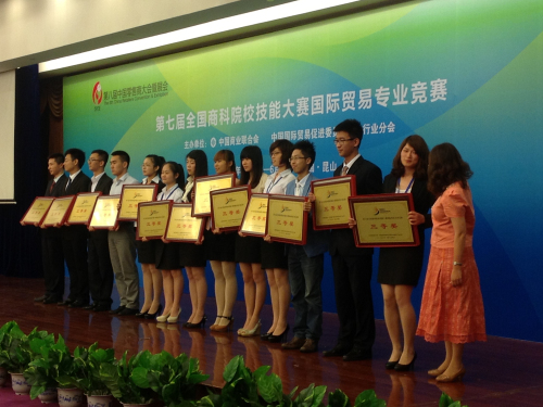2013年5月29日至6月2日,“第六届全国商科院校技能大赛国际贸易专业竞赛总决赛”在江苏省昆山市举行,本次竞赛是由中国商业联合会、中国国际贸易促进委员会商业行业分会联合主办,中国商业联合会培训部承办的全国性商科教育学科竞赛活动。共有来自全国17个省、自治区和直辖市的56所高等院校的83支参赛队伍(其中本科组52支、高职高专组31支)800余名参赛选手和辅导教师入围全国总决赛。我院财经系由刘小丽、韩倩倩两位老师带领梁豪、郑丹敏、蔡瑶、何嘉妍和张意欣五位同学组队参赛,荣获全国商科院校技能大赛总决赛三等奖。