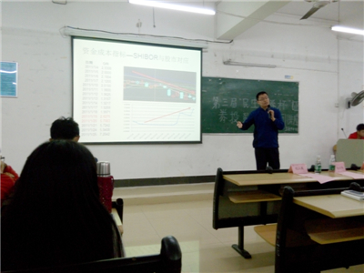讲座中赵金伟老师以“投资与盯盘”为题,与同学们分享了炒股人常见的心理现象和投资问题,并用幽默的语言总结到“炒股就是根据当前的条件,做出当前自认为对自己最有利的决策,结果只有天知道”。随后,用“趋”与“势”的观点进行了股票K线分析,从股票的买入价位到资金仓位的轻重两个方向与大家分享了投资经验与技巧,从货币政策、财政政策、企业盈利三个股市走强的原始动力和大家分享了基本面分析的方法和经验,并用SHIBOR指标验证了股票走势与其是正好相反这一观点。最后也谈到了炒股的风险,并总结到“除非你已经上岸,否则不要在股市这片汪洋中休息,要时刻警醒”。赵金伟老师精彩的演讲既让同学们认识到炒股的妙趣所在,也让大家知晓了投资的风险所在。接着,同学们与赵金伟老师进行了积极的互动,共同分享了对这次讲座的感想。