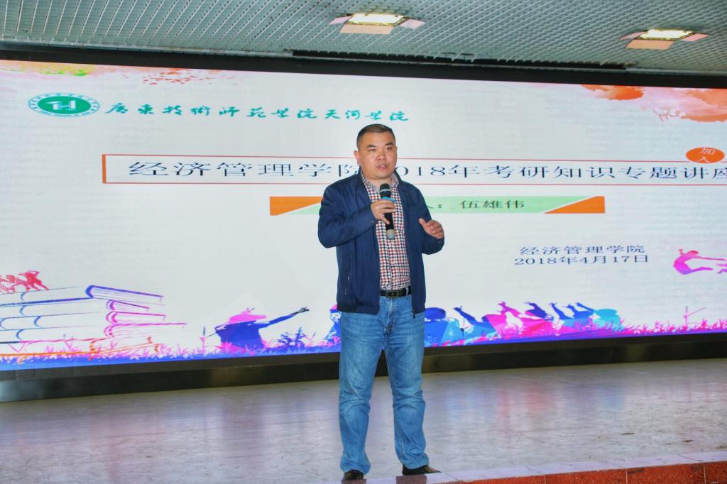 伍雄伟就考研意义、考研政策、考研途径与方法展开讲座,从定专业、选学校、备考、报考、笔试、复试、调剂等方面详细讲解了考研的步骤,希望同学们培养自信、保持乐观、积极应对、刻苦认真,扎实做好复习工作。他认为,对待考研不必过于紧张,应当扎实复习,充满自信。最后,伍老师强调,考研学生不要盲目应对,要根据自身的特点制定复习计划。