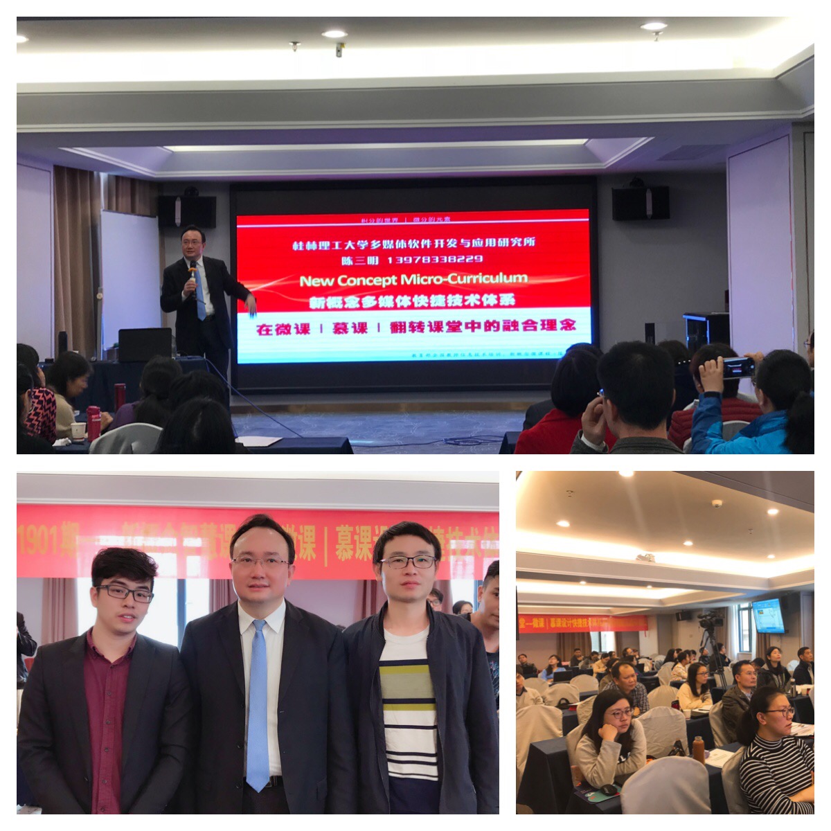 此次培训由教育部“全国教师信息技术培训(TITT)”认证专家、桂林理工大学陈三明教授主讲。目的是促进信息技术与课堂教学深度融合,解决信息化教学“怎样应用”的问题;做好微课资源建设工作,解决信息化教学“有什么可用”的问题。围绕培训的目的,“新概念智慧课堂--微课、慕课设计快捷技术体系及课堂创新”高级研修班正式拉开序幕,来自全国12个省份、30余所学校的近百位老师,用满腔的学习热情,尽情地享受了陈三明教授带来的精彩学术分享。