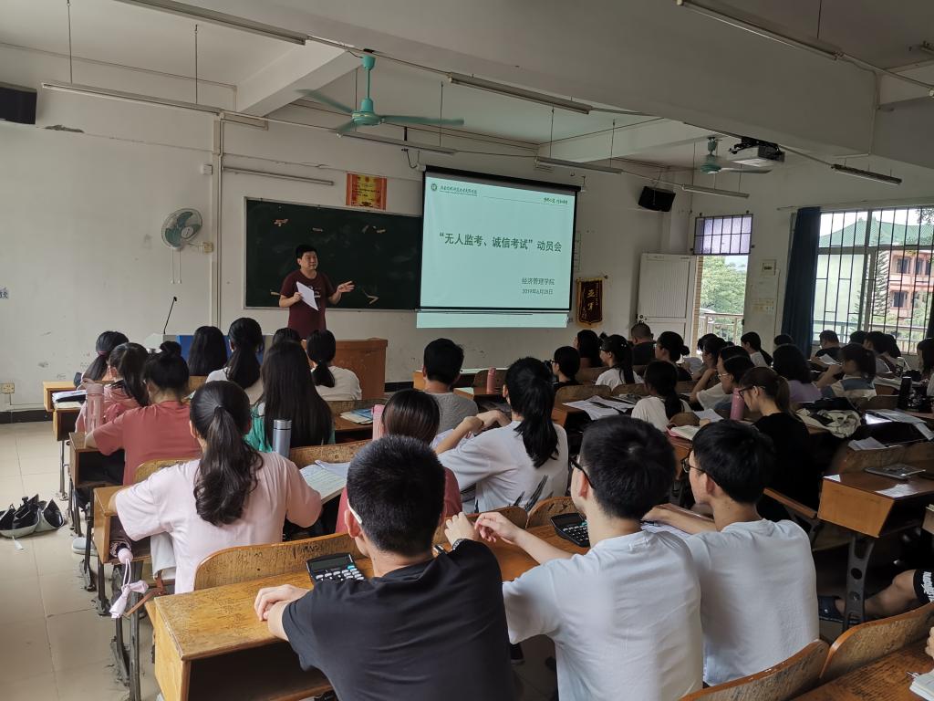 谭书记强调,诚信乃中华民族的传统美德,更是一个人的立身之本,全体同学务必统一思想,高度重视,在考试过程中加强自我约束和自我监督,杜绝任何舞弊行为。张院长在讲话中,向同学们讲述了“无人监考、诚信考试”的背景、制度,并提出三点希望,一是提醒同学们充分认识诚信考试的重要性;二是要求同学们认真备考,不辜负学院对同学们的期望;三是敦促同学们遵守考场纪律,杜绝任何舞弊行为。