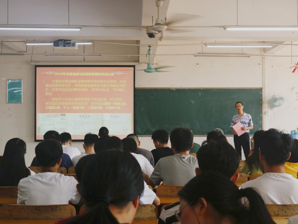 会上,大赛承办单位代表莫业锋经理公布了我院2019年全国金融与证券投资模拟实训大赛获奖情况,我院徐佳文、伍映基等26名学生在国赛中喜获团体一等奖、三等奖各1项,个人一等奖2项、二等奖9项、三等奖5项,共18个奖项,大赛指导老师倪江崴获“优秀指导老师”荣誉称号。莫业锋经理充分肯定了我院学子在比赛中的优异表现和所取得的成绩,并鼓励同学们积极参加学科竞赛,在竞赛中培养自己的学习能力、团队协作和实践能力,利用竞赛锻炼自己、提升自己。
