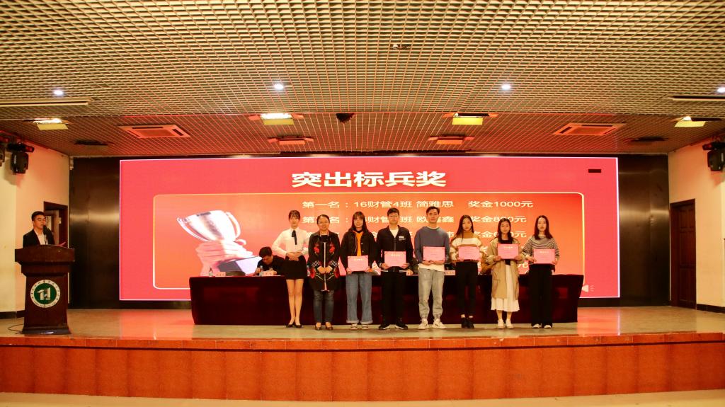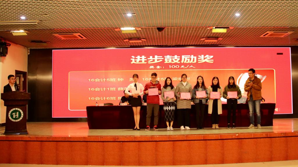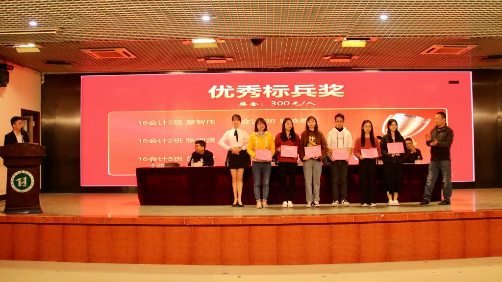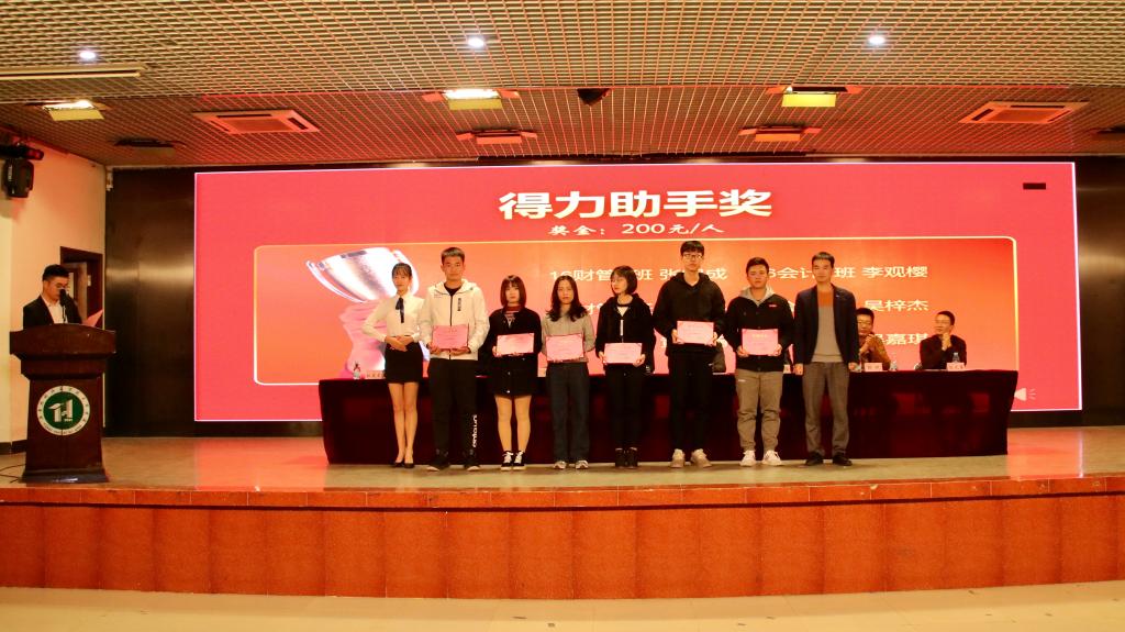 张志红副院长宣读关于2019年财会专业优秀实习生的表彰决定。简雅思等6名同学获得突出标兵奖,蔡智伟等6名同学获得优秀标兵奖,张智成等6名同学获得得力助手奖,梁晓彬等6名同学获得进步鼓励奖,共24名实习生获奖,发放奖金达7200元。郭琪经理、张岚经理、杨洪亮经理、邢风云院长上台为获奖学生颁奖。颁奖现场,同学们为获奖同学喝彩,掌声不断。