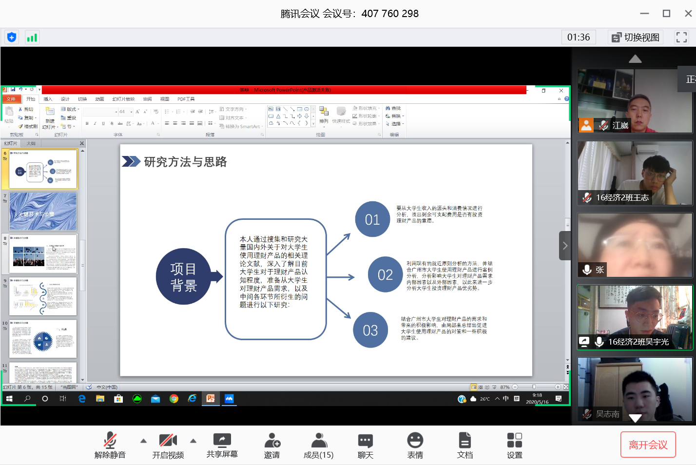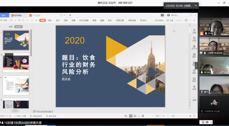 答辩当天,各答辩组师生准时进入腾讯会议平台,评委老师和陈述论文的学生均开摄像头。学生陈述前验证身份证或学生证,学生陈述时通过共享屏幕将论文ppt同时展示给各评委老师,答辩评委老师严格把关,依次提出问题及修改意见。小组学生全部答辩完后,答辩小组组长根据各评委老师评分宣布答辩结果。整个答辩组织严谨、流程规范,关键环节进行截屏保留,并与答辩记录一并保存。 同时,学校高度重视此次特殊的答辩工作,5月11日上午,学校谭海鸥副校长亲临经济学专业第一答辩组检查和指导答辩工作,对经济学专业的答辩组织给予了充分肯定和积极评价。