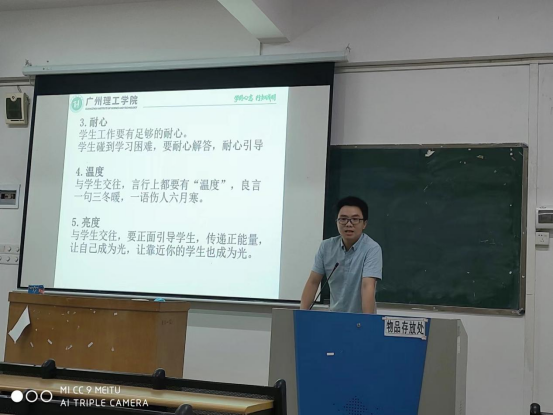 优秀班导师代表王志勇博士和胡晓玲老师分别做经验分享。王志勇博士以三心(细心、耐心、责任心)和二度(温度和亮度),分享自己平日与学生相处的方式和方法,并强调重要时刻一定要与学生在一起,以提升学生的参与感、获得感、幸福感。胡晓玲老师表示,要以生为本,以真情、真心、真诚教育和影响学生,努力成为学生的良师益友,做学生成长成才的引路人。