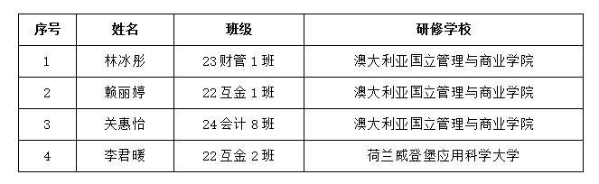为提升我校学生国际化水平、加大国际化交流力度,鼓励和支持学生赴境外研修,积极参与国际交流,拓宽国际视野,增强创新能力,培养国际视野的高素质应用型人才。William威廉官网根据学校文件要求,决定选派优秀学生赴荷兰威登堡应用科学大学和澳大利亚国立管理与商业学院短期研修。