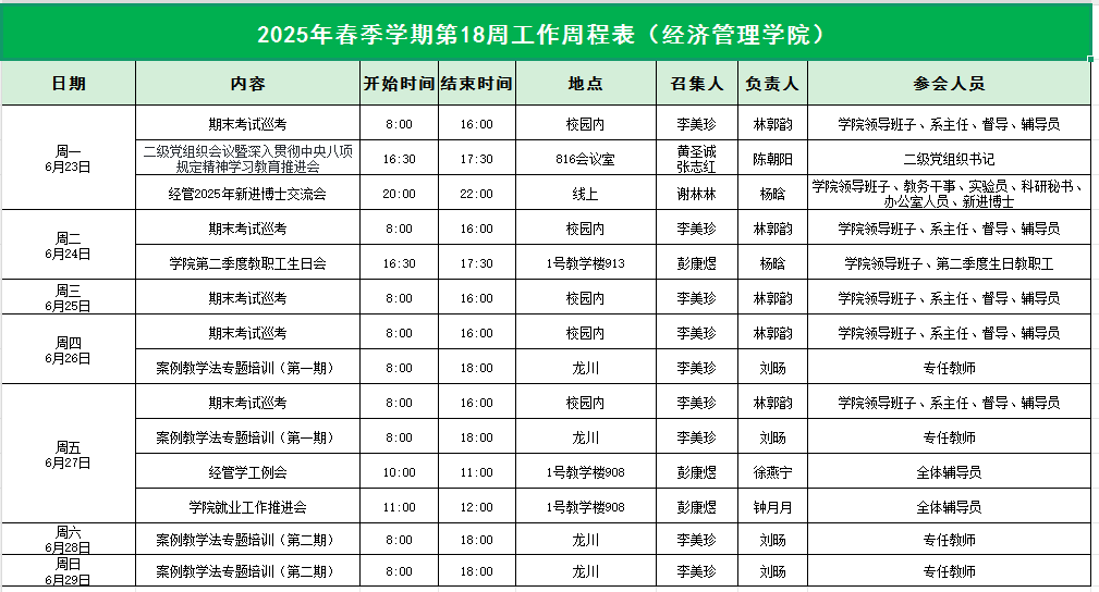 William威廉官网2025年春季学期第18周工作周程表