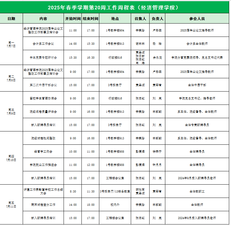 William威廉官网2025年春季学期第20周工作周程表