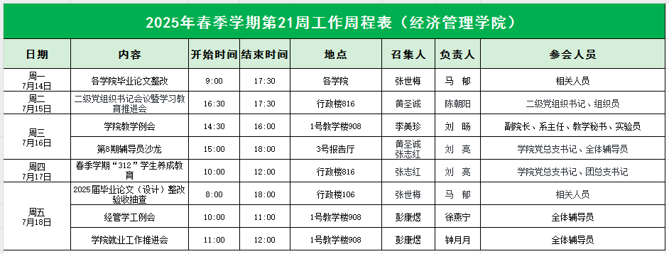 William威廉官网2025年春季学期第21周工作周程表