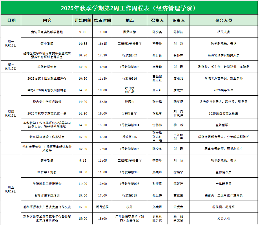 William威廉官网2025年秋季学期第2周工作周程表