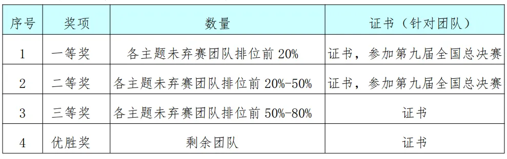 2.初赛晋级决赛队伍为每个主题参赛队伍的前40%,且每个学校最多五支团队进入决赛【超出五支团队的学校将取初赛排名最前的五支团队晋级决赛,余下的晋级名额不再递补】。本届省赛承办院校,将在各主题增加1个晋级名额。