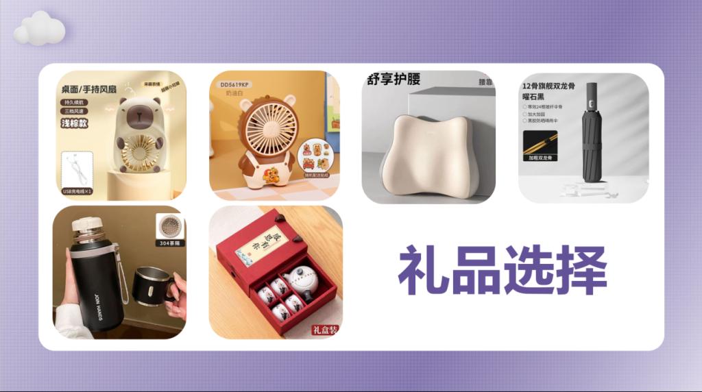 精美礼品展示:风扇、U型枕、靠背、茶具、雨伞、保温壶等
