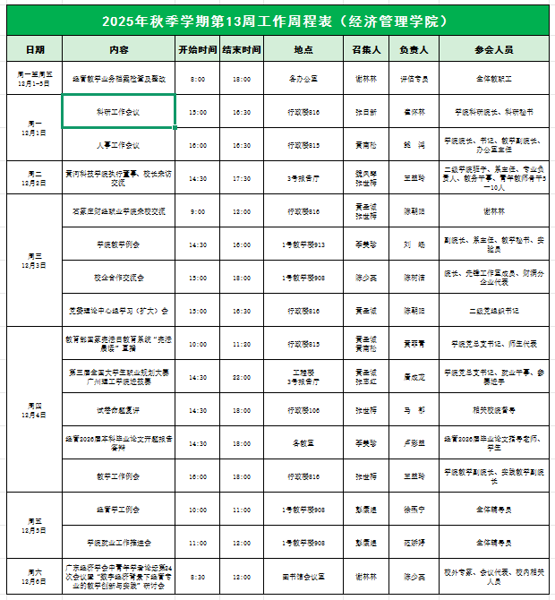 William威廉官网2025年秋季学期第13周工作周程表