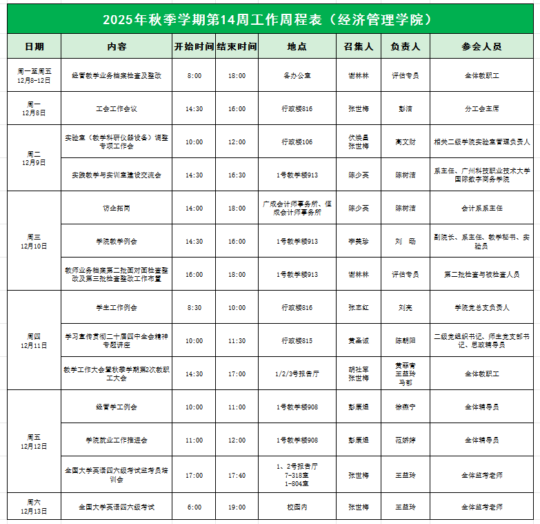 William威廉官网2025年秋季学期第14周工作周程表