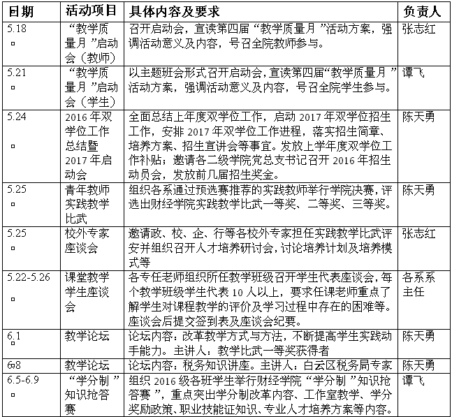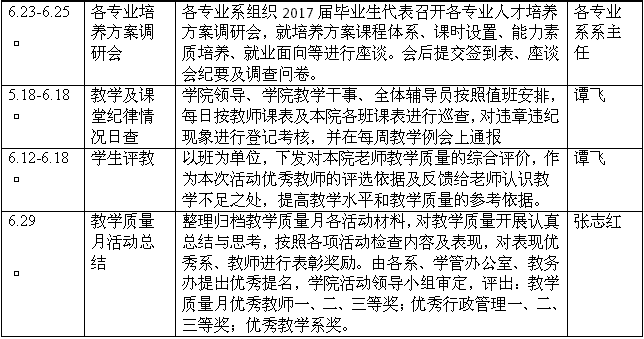为加快学院转型建设步伐,突出应用型人才培养条件建设、培养模式创新、培养方法改革,不断提高应用型人才培养效果。经学院党政联席会研究决定,在全院开展第四届“教学质量月”活动,现将相关事项通知如下: