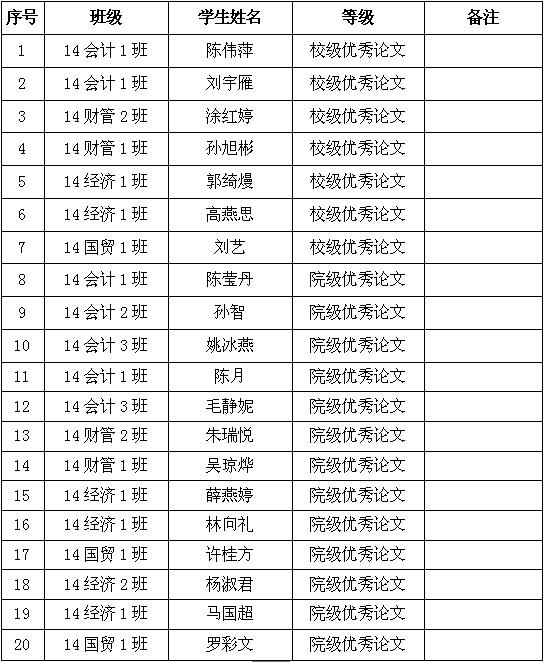 2018届毕业论文已顺利完成,学生们在论文工作过程中,态度认真,刻苦钻研,服从导师指导。积极参与社会实践,顺利通过论文答辩。经学院学术分委员会评审后决定,授予财务管理、会计学、经济学,国际经济与贸易四个专业共20名同学撰写的毕业论文为“优秀毕业论文”,予以全院通报表彰。