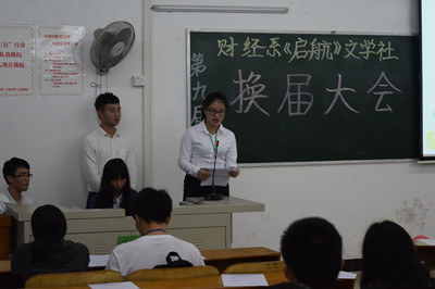 会议在换届短片中拉开了序幕。第九届编委办公室副主任兼财务主管邹倚丽作上一年度财务报告;第八届财经系《启航》文学社主编钟宁作上一学年的工作总结,对学院领导及老师们的支持表示感谢,期望“启航文学社”走的更远,飞得更高,为活跃天河学院校园文化作出应有的贡献!