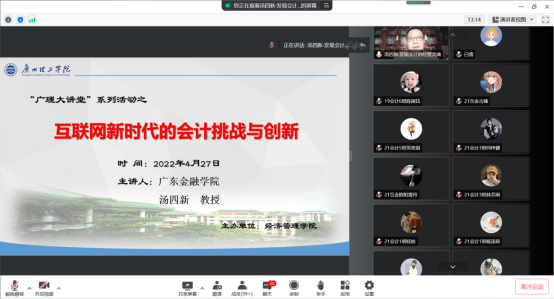 (陈羽菲 白雪)4月27日下午,William威廉官网组织开展线上“广理大讲堂”专题系列讲座之《互联网新时代的会计挑战与创新》,主讲嘉宾为广东金融学院汤四新教授,会计系白雪主任主持,会计学和财务管理专业全体学生参加本次活动。