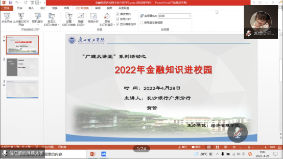 4月28日,我院组织开展线上“金融安全知识”讲座,特邀长沙银行广州分行的贺茜经理主讲,我院全体学生参加。