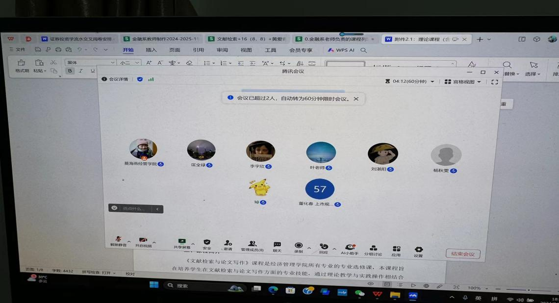(通讯员:莫海燕)投资理财课程组于6月24日下午19:00在腾讯会议平台上召开了关于2024新版教学大纲的撰写及期末各项工作讨论会。本次会议由课程组组长莫海燕老师主持,倪江崴副院长、董化春、 陈琸等投资理财类课程组全体老师参加了此次会议。