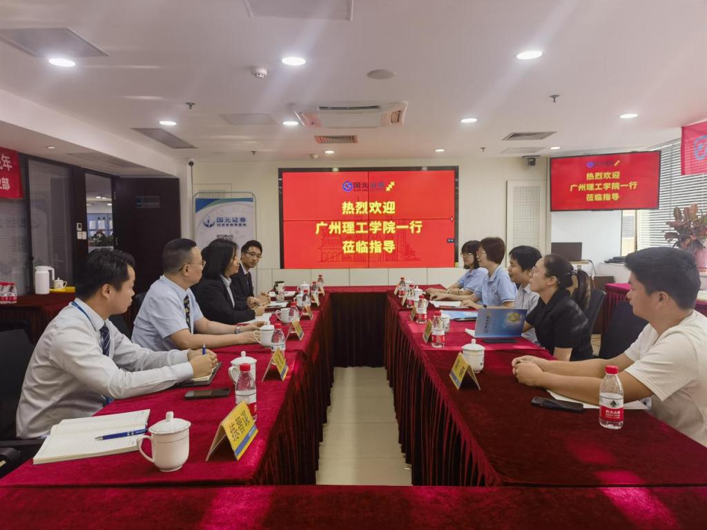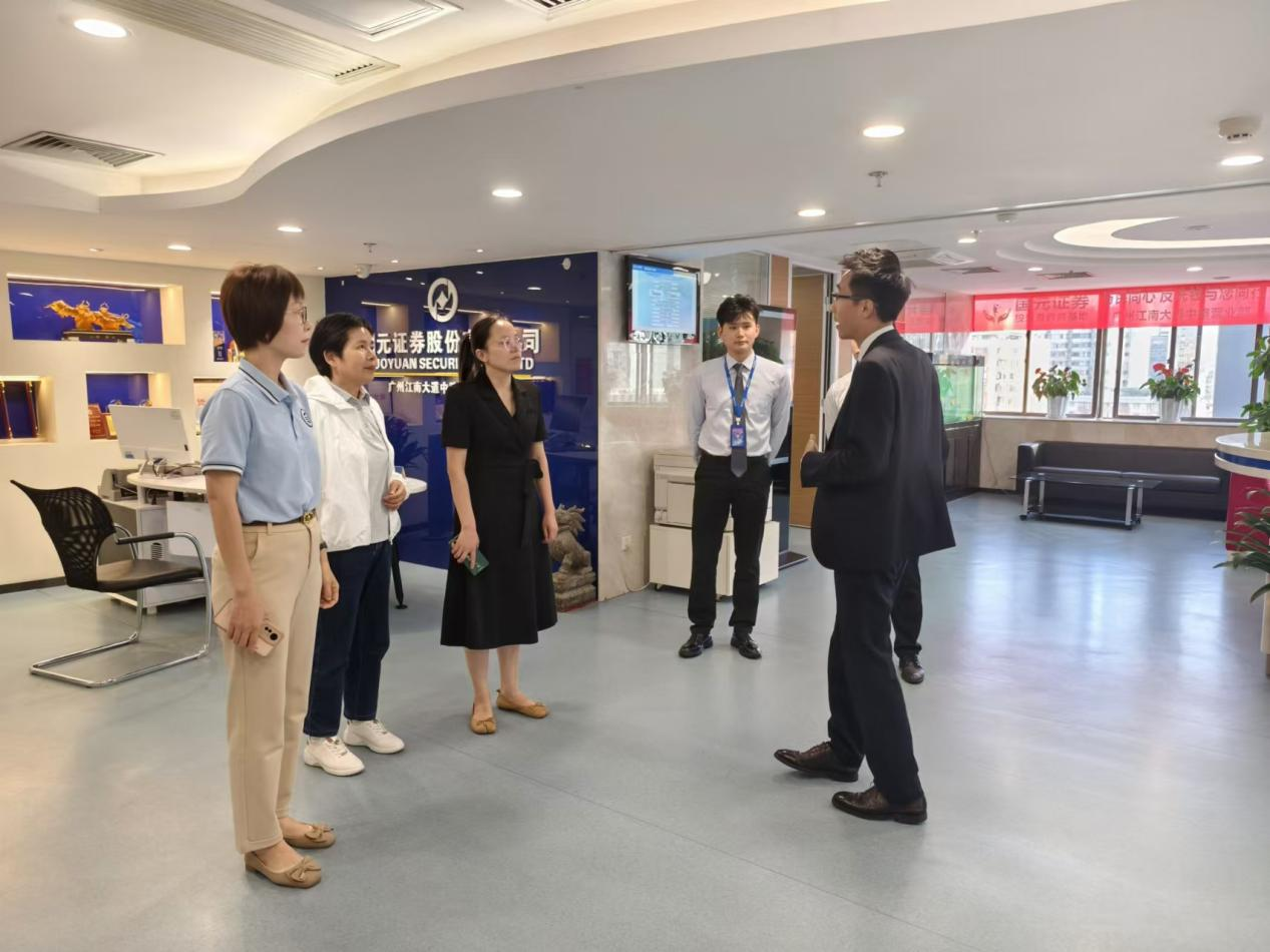 首站我们抵达了国元证券股份有限广州江南大道中路营业部,刘敏仪总经理、刘业成总监等人迎接我校领导老师们的到来。刘总监首先向我们介绍了企业的发展历史和未来前景,也带领我校领导老师们参观了企业内部。