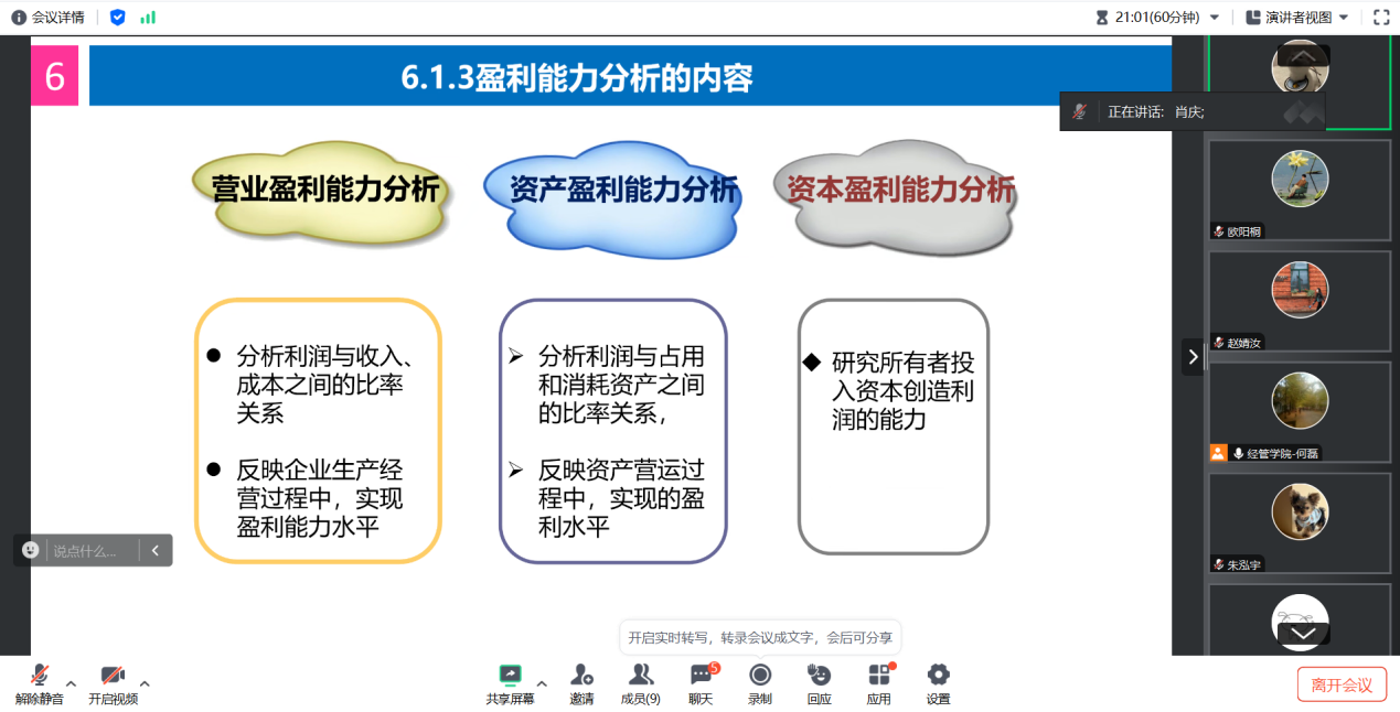 在磨课和听课环节时,何磊老师建议教授同一门课程的老师可以互相听课,在保持自身独特授课风格的同时,借鉴其他优秀教师的教学方式,提升自身教学能力。接着,肖庆老师以其主讲的《财务报表分析》课程为例,进行了生动的展示。她简要介绍了该课程的课时安排和主要内容,并特别以“盈利能力分析”这一章的部分内容,展示了她平常授课的方式及过程。肖老师通过案例分析、小组讨论等多样化的教学手段,激发学生的学习兴趣,培养学生的分析问题和解决问题的能力。