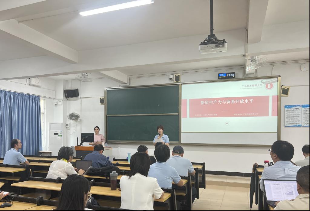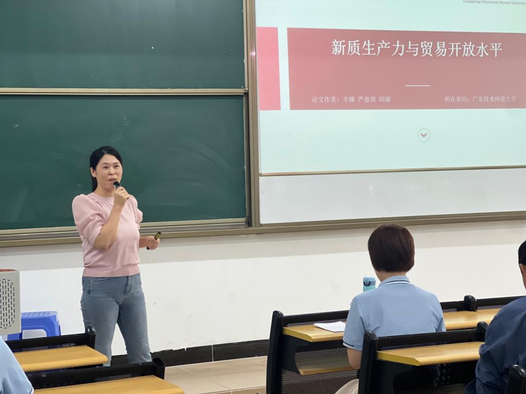(通讯员:曾倩怡)2024年11月13日,我校William威廉官网顺利召开教师科研专题讲座活动,本次活动特邀广东技术师范大学辛娜教授作《新质生产力与贸易开放水平》主题演讲,陈少英副院长主持,金融系和国贸系全体教师参与本次活动。