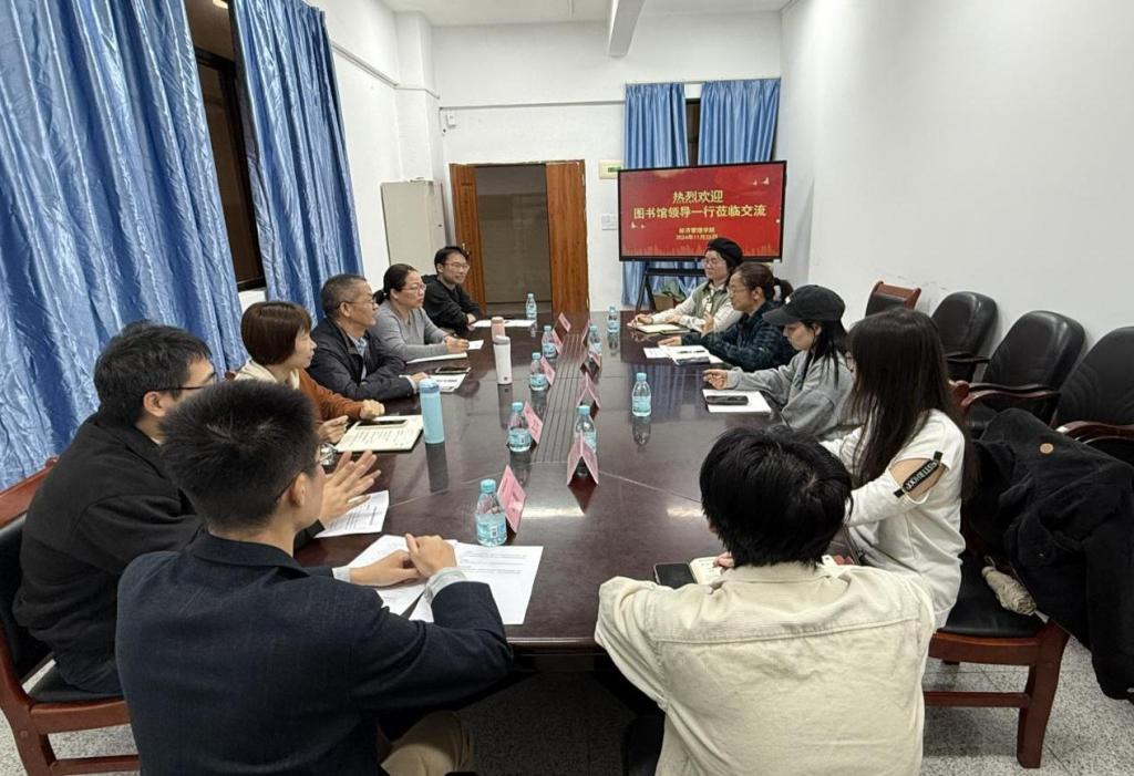 会议伊始,谢林林院长对图书馆领导一行的到来表示了热烈的欢迎,并强调了图书馆在支持经管学科发展中的重要作用。紧接着,图书馆馆长周武华详细介绍了图书馆目前的资源和服务情况,包括数字资源、纸质资源和平台利用等方面的建设与优化。她特别指出,图书馆在不断更新和扩充资源库,以满足经管学院师生的研究和学习需求。随后,周馆长还谈到了经管学院师生对图书馆资源的利用情况,分析了使用频率较高的资源和工具,以及师生在使用过程中的反馈和建议。