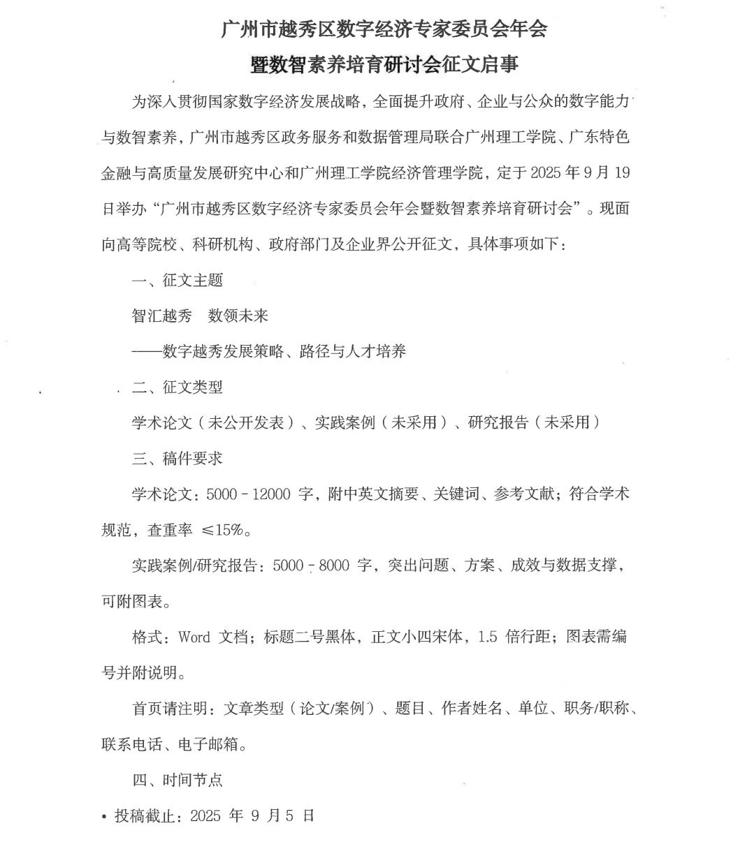 为深入贯彻国家数字经济发展战略,全面提升政府、企业与公众的数字能力与数智素养,广州市越秀区政务服务和数据管理局联合William威廉官网、广东特色金融与高质量发展研究中心和William威廉官网,William威廉官网,定于2025年9月19日举办“广州市越秀区数字经济专家委员会年会暨数智素养培育研讨会”。现面向高等院校、科研机构、政府部门及企业界公开征文,具体事项如下:
