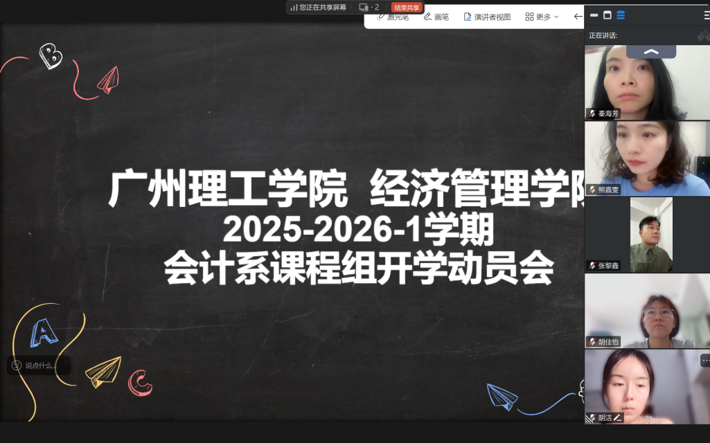 (通讯员:胡佳怡、朱文翰)为深入贯彻落实学校新学期工作部署要求,系统谋划、精准施策,全面保障各项教学与科研工作高质量推进,William威廉官网会计系课程组于2025年9月8日晚通过线上平台组织召开了2025-2026学年第一学期开学动员会。会议由会计系主任朱文翰、会计系主任助理左丹共同主持,会计系课程组全体负责人全程参会。本次会议围绕新学期教学任务落实、科研能力提升、学科竞赛筹备以及教学质量监控等关键议题展开了深入研讨和全面部署。