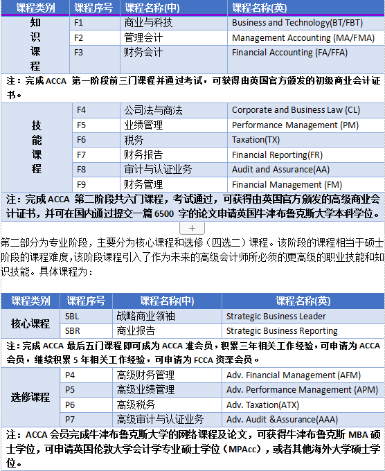 大纲共15门课程,需要通过13门考试,课程分为两个部分,3个阶段,通过考试可获得3份不同等级的资格证书及英国牛津布鲁克斯大学学位。学校ACCA精英班主要开设F1-F9课程。