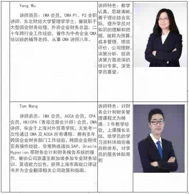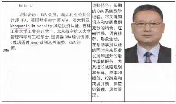CMA精英班的专业课程师资是由IMA美国管理会计师协会官方认定的中博教育集团提供,创始于2004年的中博教育集团已与400余所高校建立合作关系,共同培养具备前沿性的国际财务、金融知识以及先进企业管理理念的复合型国际财经人才。中博教育拥有400余名优佳讲师,皆为CMA会员、FRM会员、ACCA会员、CIMA会员、CFA会员且多人同时持有CPA执照、AICPA执照、HKICPA执照、澳洲注册会计师执照等。半数以上讲师硕士毕业于美国常春藤高校、英国G5高校或中国C9高校。多数讲师曾在世界500强机构担任中高层管理者,拥有丰富的教学和实操经验。