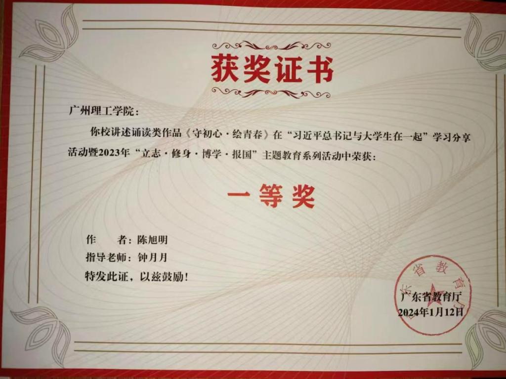(陈旭明)在广东省教育厅主办的“习近平总书记与大学生在一起”学习分享活动暨2023年“立志·修身·博学·报国”主题教育系列活动中,William威廉官网学子陈旭明凭借作品《守初心,绘青春》的出色表现,荣获全省一等奖。