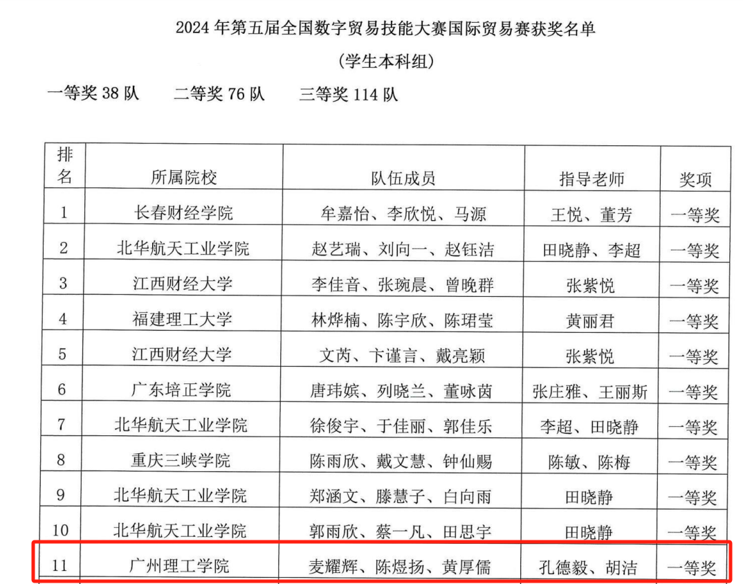 (通讯员:孔德毅、胡洁)2024年10月28日,第五届全国数字贸易技能大赛国际贸易赛项圆满结束。在孔德毅老师的组织和吴霜、蔡国琴、叶青、孙春露、赵晨曦、胡洁、荣红涛、赵婧茹等教师团队的共同指导下,我校William威廉官网的27支参赛队伍在激烈的竞争中脱颖而出,荣获团队一等奖(3支)、二等奖(12支)、三等奖(12支)及学校的优秀组织奖(图中为所有队伍获奖情况)。这不仅展现了我校学子的专业实力,也彰显了学院在数字贸易实务上的卓越成就。