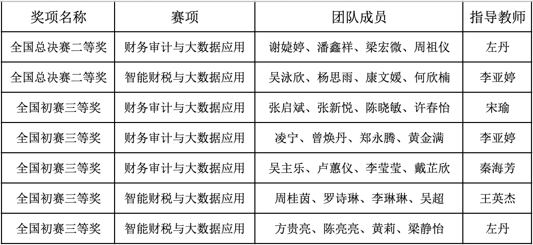 基于选拔,我院最终派出8支队伍共32名学生参与智能财税与大数据应用、财务审计与大数据应用两个赛道的比赛。在左丹老师、李亚婷老师、王英杰老师、宋瑜老师和秦海芳老师的悉心指导下,经过激烈角逐,我院学生团队凭借扎实的专业知识、出色的团队协作以及精准的财务大数据应用能力,在众多参赛队伍中脱颖而出,荣获了2个全国总决赛二等奖和5个全国初赛三等奖,为学院争得了荣誉,展现了我院学子在财务领域的卓越风采。