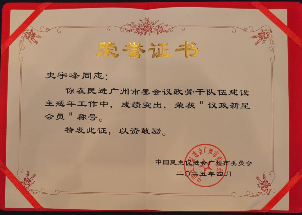 (通讯员:史宇峰)4月13日,民进广州市委员会召开“2025主题年”工作会议,会议表彰了议政先进集体和先进个人。我校William威廉官网史宇峰博士被评为议政先进个人,获得“议政新星会员”称号。