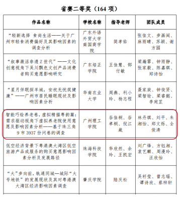 另外,由谷佳桐、谷卓桐、倪江崴三位老师持续续孵化的跨学院作品《智能巧绘养老卷,虚拟精描粤韵篇:需求驱动视角下虚拟养老院使用意愿及影响因素分析》荣获省级二等奖,团队成员林丹琪、刘平、朱湘怡、郑文烁与全俊涛来自计算机科学与工程、工商管理、人工智能等多学院,充分体现了我校“新工科+新商科”交叉融合的培养特色,彰显了多学院协同育人的创新成效。