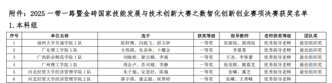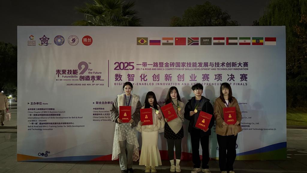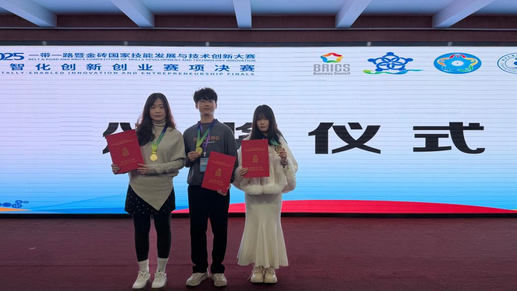 2025一带一路暨金砖国家技能发展与技术创新大赛之数智化创新创业赛项(本科组)全国总决赛于11月30日在浙江交通职业技术学院(杭州校区)成功举办,在我校徐英煕、熊嘉雯两位老师的共同指导下,我校学子们此次大赛中表现出色。由周金卢、李静、苏可晴三位同学组成的团队喜获国家级一等奖,充分展现了学院同学的应用型专业素养和团队协作能力,也是学院教师坚持实施产教融合与赛教融合效能的又一体现。